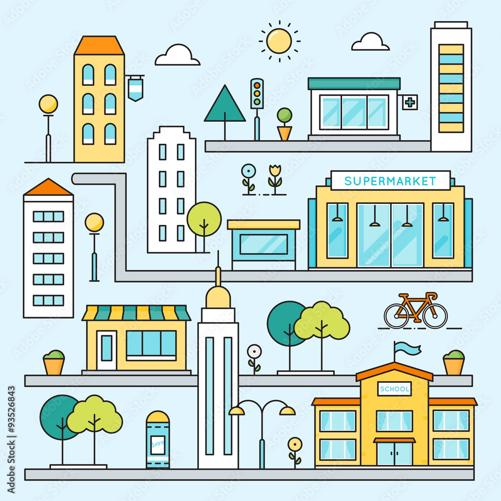 City Map with Streets, Buildings and Places Vector Outline Colored
